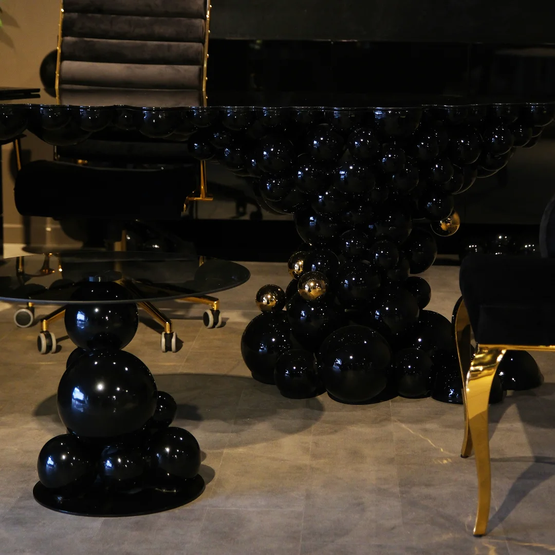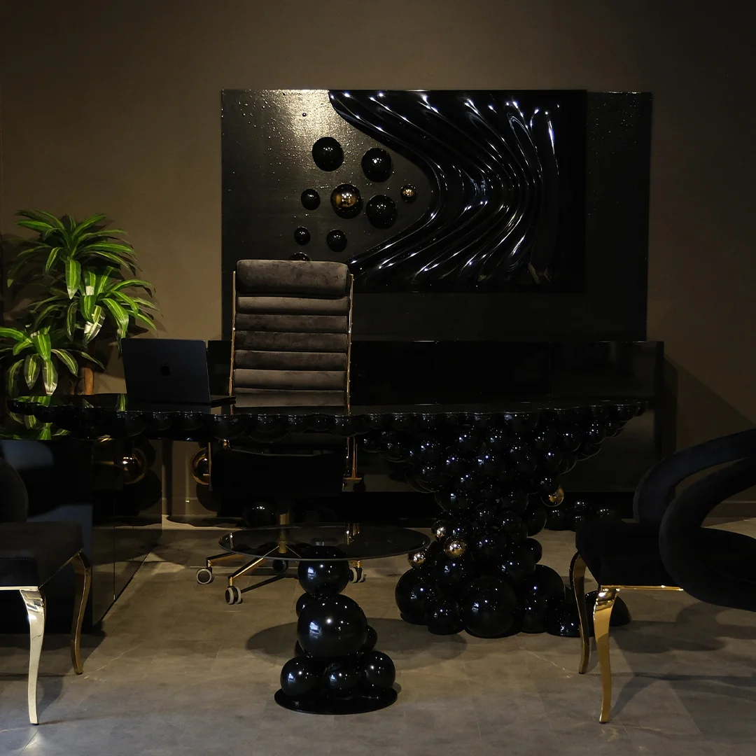 Bubble Yönetici Takımı, ofis mobilyasında heykelsi bir yaklaşım sunar. Tasarımın merkezinde baloncuk formu vardır. Ayaklardan konsola, sehpaya ve kitaplığa kadar her parça; parlak kürelerin dansından oluşur. Siyah ve altın tonlarıyla birleşen hacimli yapısı, ofisinize yalnızca tasarım değil, karakter de kazandırır.