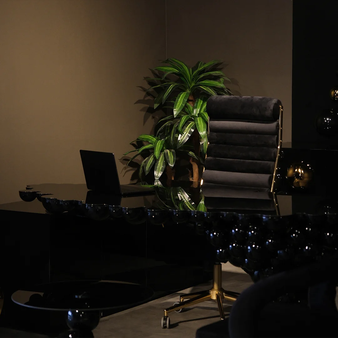 Bubble Yönetici Masası, baloncuk formundaki ayakları ve hacimli yapısıyla öne çıkar. Siyah ve altın detaylarla birleşen tasarımı ofisinize iddialı bir görünüm kazandırır.